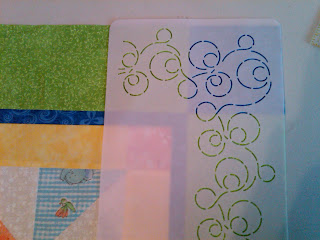 This will be Em's first baby quilt. I'm using a motif for the blocks, and I am thinking about using the bubbles stencil for the border. I finished quilting the blocks already, and I just did swirls in the lattices. One of my sewing machines is on the blitz now, so its on hold until I get it fixed.
